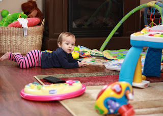 She has nothing, can you tell? She is such a mess. She hardly wants to play on the floor anymore - she is pulling up on everything. While at a friend's house the other evening, Logan cruised all along the back of their dining chairs, they had rails so she could easily hang on and cruise! We are so proud of her. She is really making great progress. Still no crawling though.
